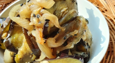 가지 3개(450g),식용유 2 큰술(밥숟가락 : 4큰술),채 썬 양파 반 개(100g),물 2 큰술(밥숟가락 : 4큰술),다진 파 2 큰술,다진 마늘 한 큰술,매실청 1 큰술(밥숟가락 : 2 큰술),참기름 한 큰술(밥숟가락 : 2 큰술),깻가루 1 큰술