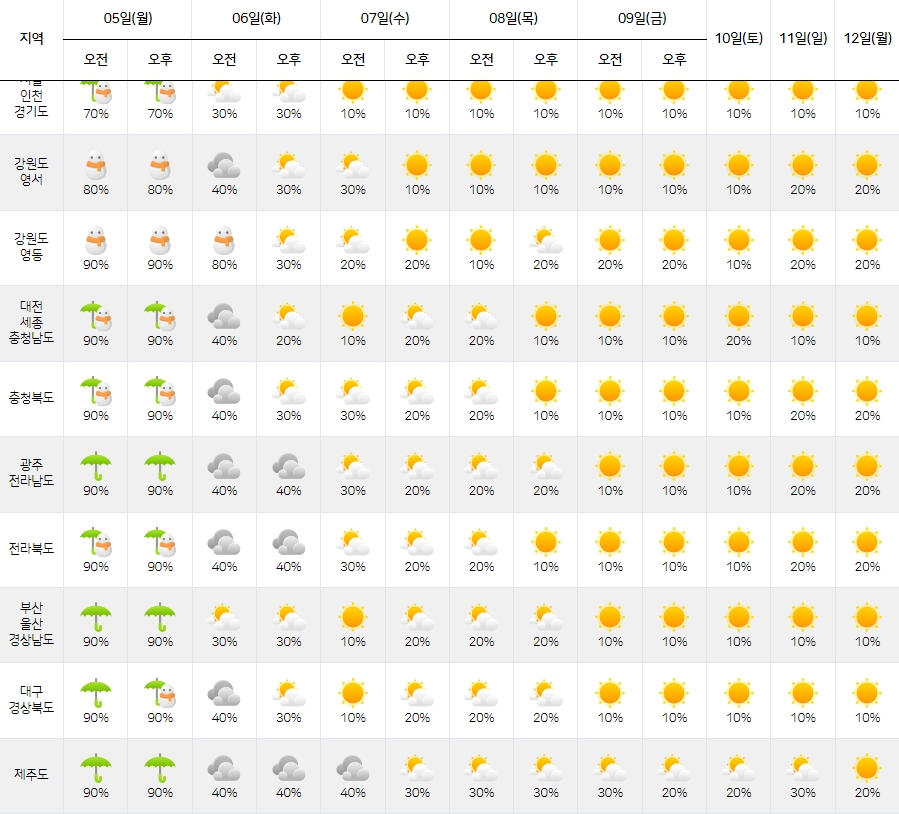 > 비 예보 : 5일(월)은 비 또는 눈이 내리겠습니다.