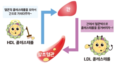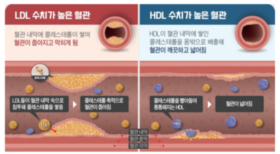 콜레스테롤은 저밀도 지질 단백질이라고 하지만, 간에서 만들어진 콜레스테롤을 혈액을 통하여 체내 조직과 세포로 운반하는 역할을 합니다. LDL 콜레스테롤은 입자가 작아 혈관 벽에 쉽게 달라붙는 특징을 갖고 있다고 합니다. 따라서 혈관에 LDL 콜레스테롤이 많다면 혈관 안에 끈적거리는 지방 덩어리(플라크)가 만들어져 동맥경화, 협심증, 심근경색등의 혈관 질환의 원인이 될 수 있어요.