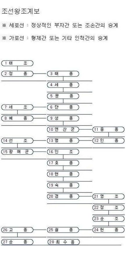 조선왕조를 저는 어릴때 노래를 부르면서 외웠지만 나이가 드니 또한이나 까먹더군요. 그래도 우리나라 민족의 역사를 알아두면 단일민족의 자긍심을 가질수 있으며 좋을 것같아요. 조선왕조 계보에 관하여 소개해드릴테니 반드시 한번 읽어보시기 바래요.