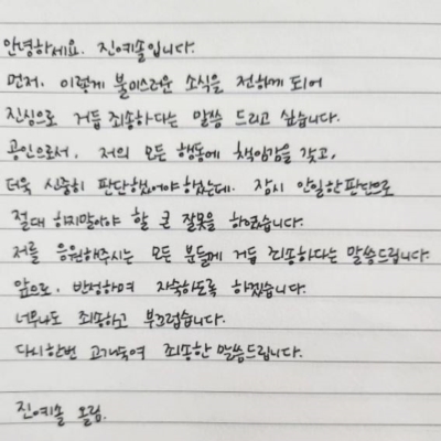안녕하세요. 진예솔입니다. 먼저, 이렇게 불미스러운 소식을 전하게 되어 진심으로 거듭 죄송하다는 말씀드리고 싶습니다. 공인으로서, 저의 모든 행동에 책임감을 가지고, 더더욱 신중히 판단했어야 했는데. 잠시 안일한 판단으로 절대 하지말아야 할 큰 잘못을 했습니다. 저를 응원해주시는 모든 분들께 거듭 죄송하다는 말씀드리겠습니다. 앞으로, 반성하며 자숙하도록 하겠습니다. 너무나도 죄송하고 부끄럽습니다. 다시 한번 고개숙여 죄송한 말씀드리도록 하겠습니다.